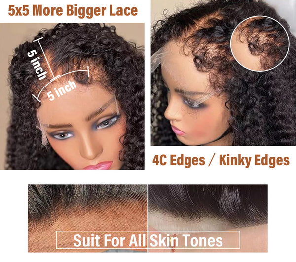 4C Edges Hairline Kinky Curly Bob 5X5 Lace Closure Wig Culry Human Hair Wigs