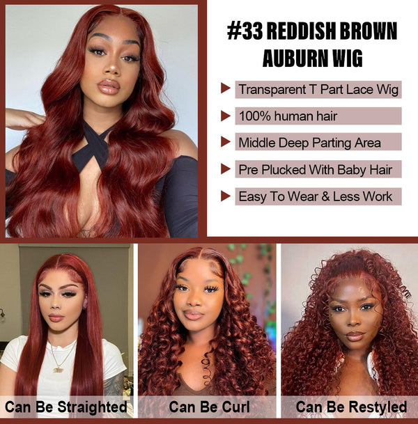 Spring Sale 33 Red Brown Auburn Brown Human Hair Wigs Body Wave Wig T Part Wig Straight Wig