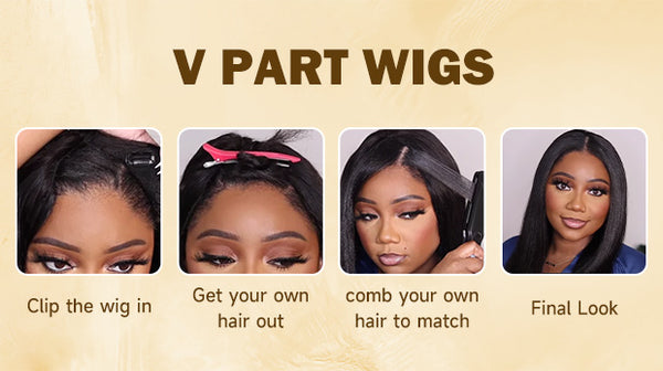 V Part wig comes with V shaped opening, inner clips, and an adjustable strap. V Part wigs has a V-shaped opening at the top, which can help you blend your natural hair with the wig well, providing a natural looking and give your hair more breathing space.
